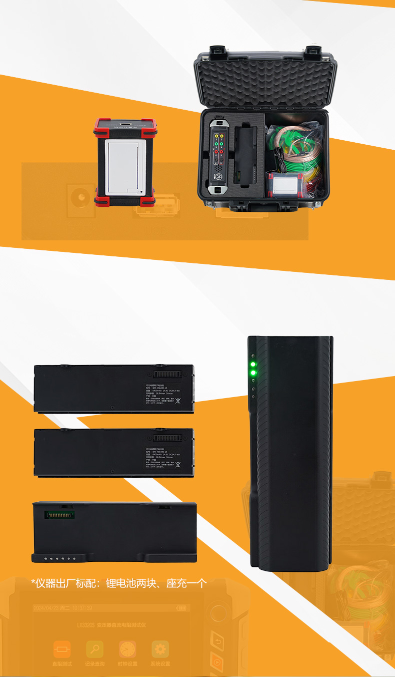 1、锂电池供电,且电池可更换,并可选配多块电池与电池座充,满足现场连续测试。